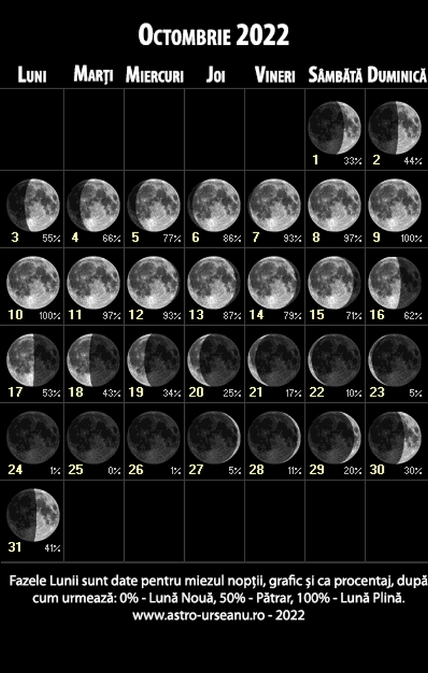 • Octombrie 2022: Luna plină – 9 octombrie / Luna nouă – 25 octombrie