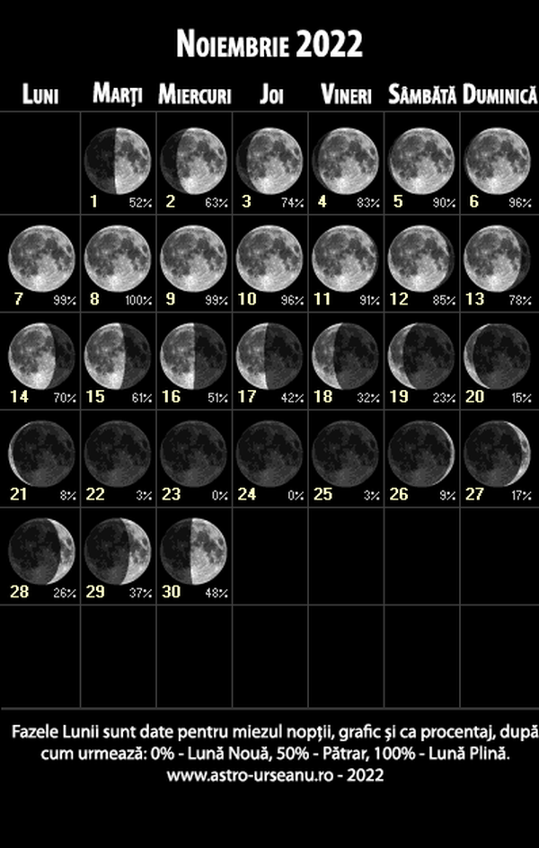 • Noiembrie 2022: Luna plină – 8 noiembrie / Luna nouă – 24 noiembrie