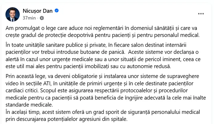 Președintele României a promulgat miercuri o lege în domeniul sănătății, inițiată de USR, prin care toate secțiile ATI din țară sunt obligate să monteze sisteme de supraveghere video. De asemenea, în fiecare salon destinat internării pacienților (public sau privat) vor trebui introduse butoane de panică.