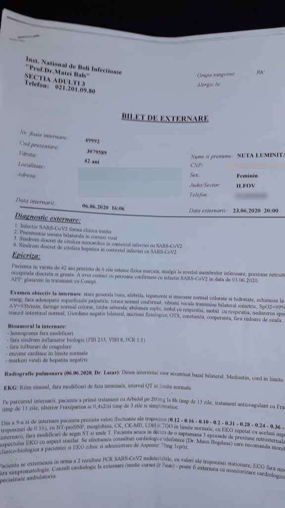 Luminița Nuța, avocat și voluntar, a fost testată pozitiv cu coronavirus și a fost internată timp de 18 zile la Matei Balș. După cele două teste negative consecutive, femeia a fost externată, iar pe biletul de externare scrie negru pe alb că aceasta trebuie să fie monitorizată cardio : „La Institutul pentru  Boli Cardiovasculare CC Iliescu, la insistențele mele, mi-au luat o troponină pe un scaun pe hol. Nu vor să facă EKG, nimic”, spune femeia.