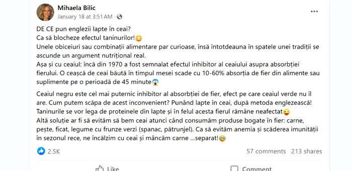 Mihaela Bilic explică: combinația ceaiului cu lapte are ca efect blocarea efectului efectul taninurilor!
