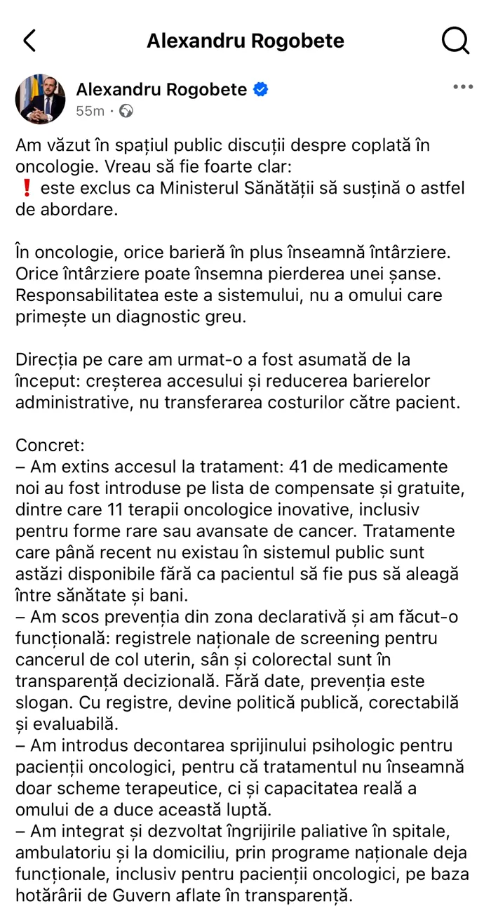 Printr-o postare pe Facebook, Ministrul Sănătății, Alexandru Rogobete, a exclus introducerea coplății în oncologie, subliniind că orice întârziere în tratament poate însemna pierderea unei șanse și că pacienții nu trebuie să plătească pentru a avea acces la terapiile necesare.