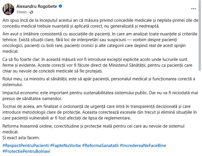 Printr-o postare pe pagina sa de Facebook, Alexandru Rogobete a anunțat că măsura privind concediile medicale și neplata primei zile va fi nuanțată și adaptată pentru a proteja pacienții vulnerabili.