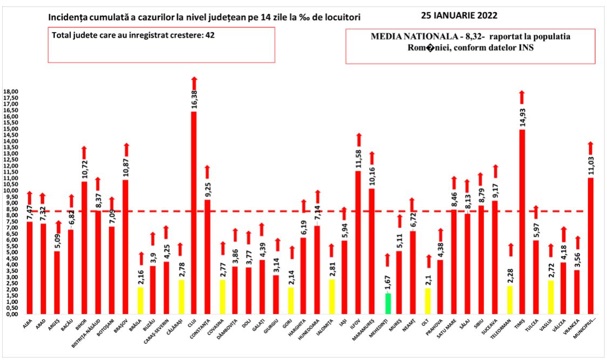 Incidența infectărilor cumulate la 14 zile, raportate la 1.000 de locuitori – calculat de către Direcțiile de Sănătate Publică, la nivelul Municipiului București și al județelor – a ajuns, marți, la 8,32 la mia de locuitori.