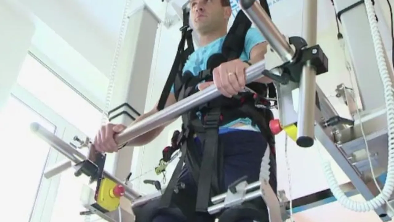 Primul pacient al robotului este un polițist criminalist din Suceava care, la 32 de ani, a rămas paralizat. În doar o săptămână de lucru la aparat, a ajuns să facă într-o oră 800 de pași.