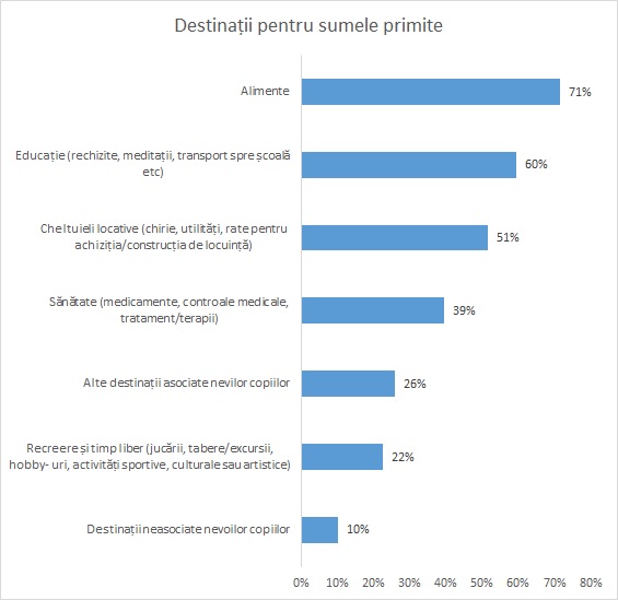 Dintre destinațiile asociate cu nevoile copilului, cel mai frecvent indicată este reprezentată de alimente – 71% din cazuri, urmată de educație (rechizite, meditații, transport etc) – 60% din eșantion – și cheltuieli locative (chirie, utilități, rate pentru achiziția sau construcția locuinței) – 51%.