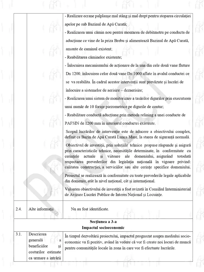 Scopul lucrărilor de intervenție este de aducere a Bazinului de Apă Curată Lunca Mare la starea de siguranță normală. Nu în ultimul rând, impactul prognozat pe durata dezvoltării proiectului asupra mediului socioeconomic va fi pozitiv, căci vor fi create noi locuri de muncă pentru comunităţile locale în zona în care vor fi efectuate lucrările, se mai arată în document.