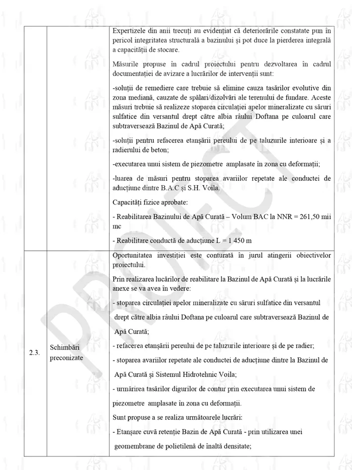 Expertizele din anii trecuți au evidențiat că deteriorările constatate pun în pericol integritatea structurală a bazinului și pot duce la pierderea integrală a capacității de stocare, se mai arată în document.