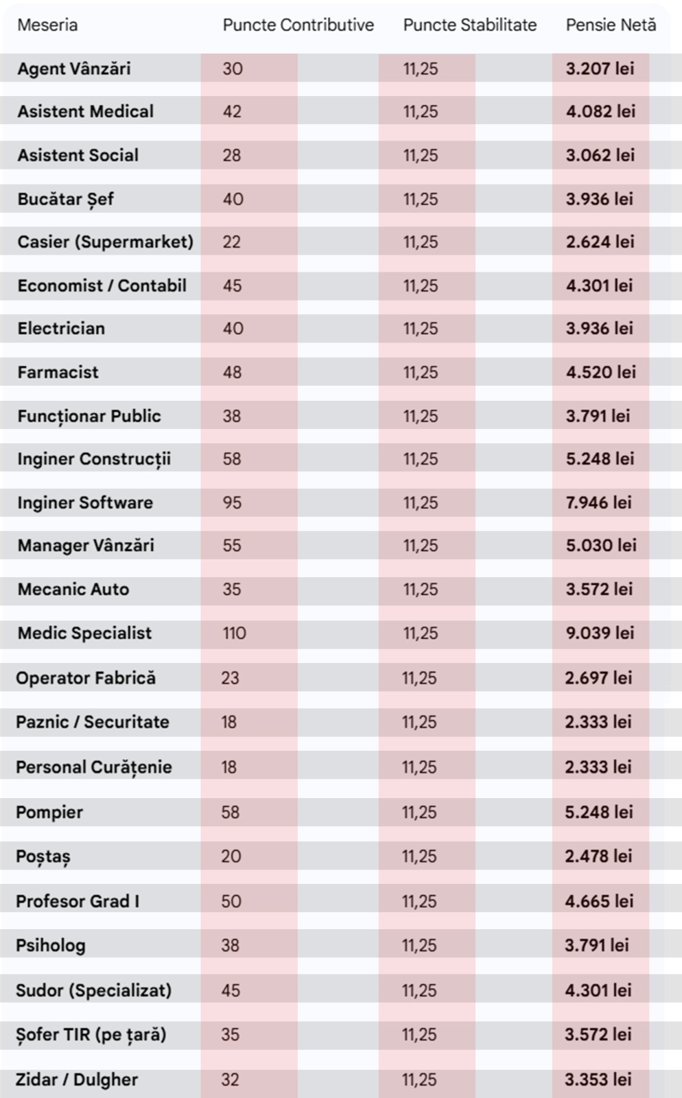 În toate cazurile analizate, s-a aplicat și punctajul de stabilitate de 11,25 puncte, acordat pentru o carieră completă, conform noii formule de calcul a pensiilor. Diferențele finale apar exclusiv din punctajul contributiv specific fiecărei meserii.