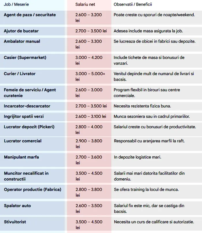 De asemenea, un ajutor de bucătar primește 2.700-3.500 lei net, iar un ambalator manual, 2.600-3.300 lei/net.