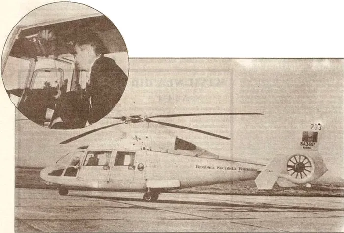 Aparatul de zbor la bordul căruia se afla cuplul Ceaușescu era un elicopter Dauphin SA-365, cu număr de înmatriculare 203, produs de firma franceză Aerospatiale, care a fost integrată în compania Airbus Helicopters.