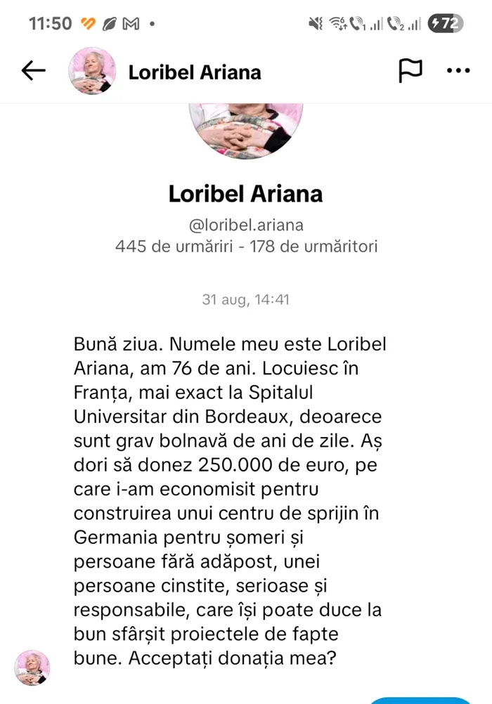 „Am văzut că, pe internet, circulă tot felul de metode de fraudare, dar am vrut să văd până unde poate să meargă persoana care m-a contactat. Primul mesaj l-am primit pe TikTok. Mi s-a cerut numărul de telefon, l-am trimis. Apoi, discuția a continuat pe WhatsApp. Mesajul primit pe telefon este următorul: «Buna ziua! Numele meu este Loribel Ariana, am 76 de ani. Locuiesc în Franța, mai exact, la Spitalul Universitar din Bordeaux, deoarece sunt grav bolnavă de ani de zile. Aș dori să donez 250.000 de euro, pe care i-am economisit pentru construirea unui centru de sprijin, în Germania, pentru șomeri și persoane fără adăpost, unei persoane cinstite, serioase și responsabile, care își poate duce la bun sfârșit proiectele de fapte bune. Acceptați donația mea?»”, povestește Alexandra B., din Iași, potrivit BZI.