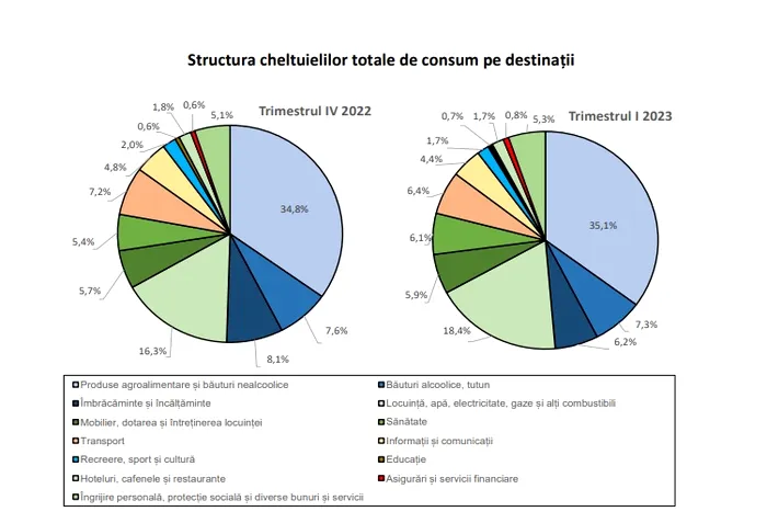 În trimestrul I 2023, principalele destinaţii ale cheltuielilor efectuate de gospodării sunt: