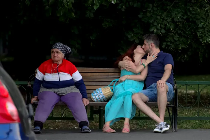 Un cuplu se saruta langa o femeie in varsta, pe o banca din Piata Victoriei, in Bucuresti. ALEXANDRU DOBRE / MEDIAFAX FOTO.