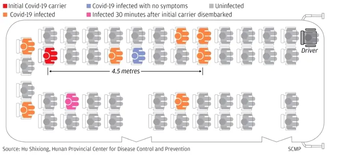 Potrivit unui studiu realizat de autoritățile chineze, un pacient infectat cu coronavirus a îmbolnăvit, în cursul unei călătorii cu autocarul, până la 13 pasageri, șapte dintre ei aproape instant.