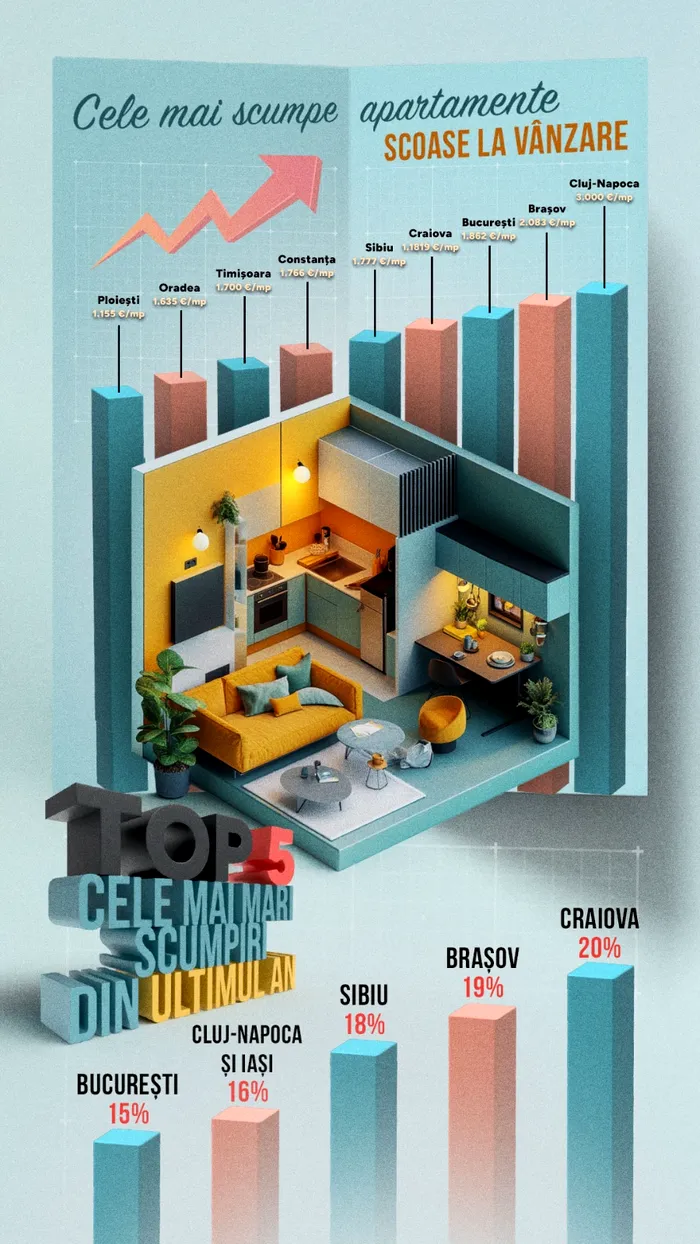 Topul celor mai mari creșteri de prețuri din ultimul an este condus de Craiova, cu 20%, după care urmează Brașov, cu 19%, și Sibiu, cu 18%. În Capitală, ponderea creșterii la începutul lui 2025 față de 2024 este de 15%.