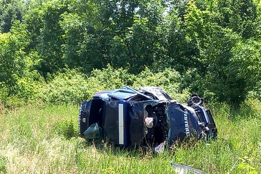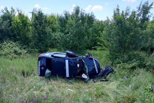 Mașina Jandarmeriei Române, aflată în misiune, s-a răsturnat și a fost aproape complet avariată.
