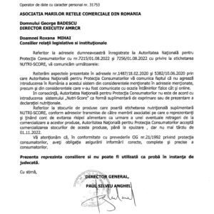 Autoritatea Națională pentru Protecția Consumatorilor preciza, în adresa către Asociația Marilor Rețele Comerciale din România (AMRCR), de la jumătatea lunii trecute, că ANPC mai acceptă ca produsele cu etichetele Nutri-Score – cu cinci culori, de la verde (aport caloric scăzut) la roșu – să nu mai fie vândute în România de la începutul lunii următoare.