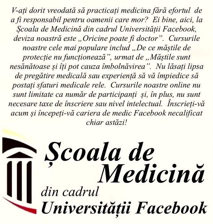 „V-ați dorit vreodată să practicați medicina fără efortul de a fi responsabil pentru oamenii care mor? Ei bine, aici, la Școala de Medicină din cadrul Universității Facebook, deviza noastră este „Oricine poate fi doctor”. Cursurile noastre cele mai populare includ „De ce măștile de protecție nu funcționează”, urmat de „Măștile sunt nesănătoase și îți pot cauza îmbolnăvirea”.