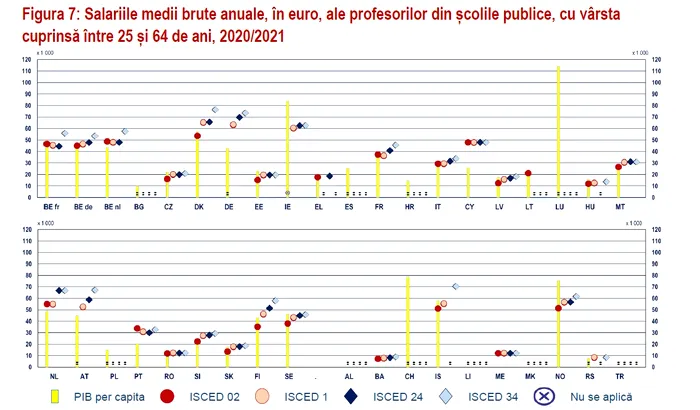 Pe de altă parte, România se numără printre cele 7 țări (Cehia, Estonia, Irlanda, Ungaria, România, Suedia și Norvegia) unde salarizarea este sub PIB-ul pe cap de locuitor, la toate nivelurile de învățământ; în alte 7 țări, există o situație similar la cel puțin unul dintre nivelurile de învățământ (în Danemarca, Malta, Slovacia și Finlanda doar la pre-primar, în Italia și Islanda la pre-primar și primar, iar în Letonia la toate nivelurile, cu excepția învățământului general secundar superior.
