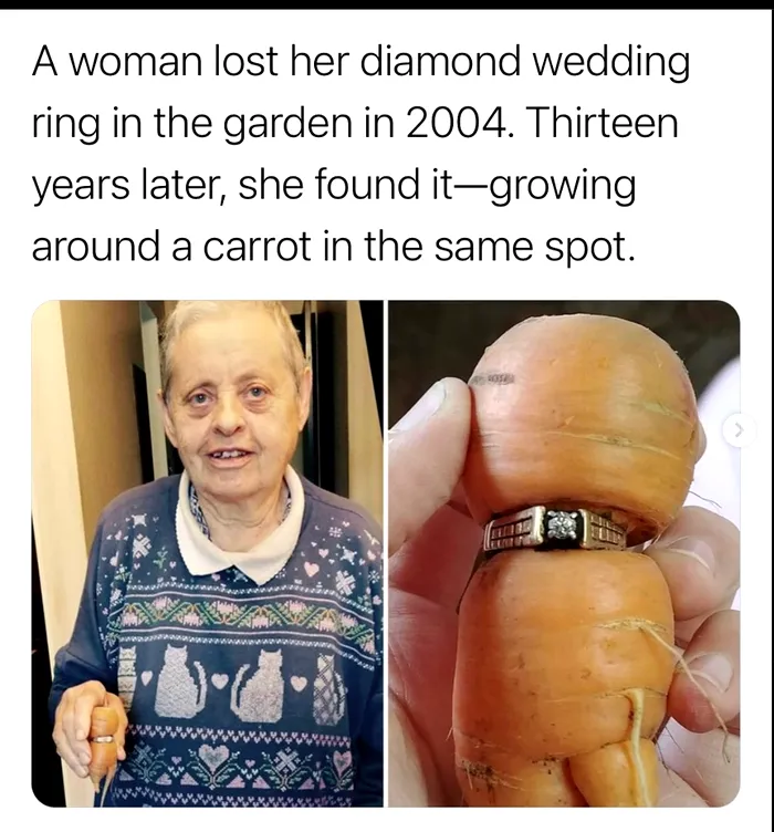 Însă, în 2004, și-a pierdut verigheta. Abia 13 ani ani mai târziu, în 2017, nora ei a găsit inelul înfășurat strâns în jurul unui morcov care crescuse în aceeași grădină în care se pierduse, potrivit BBC.