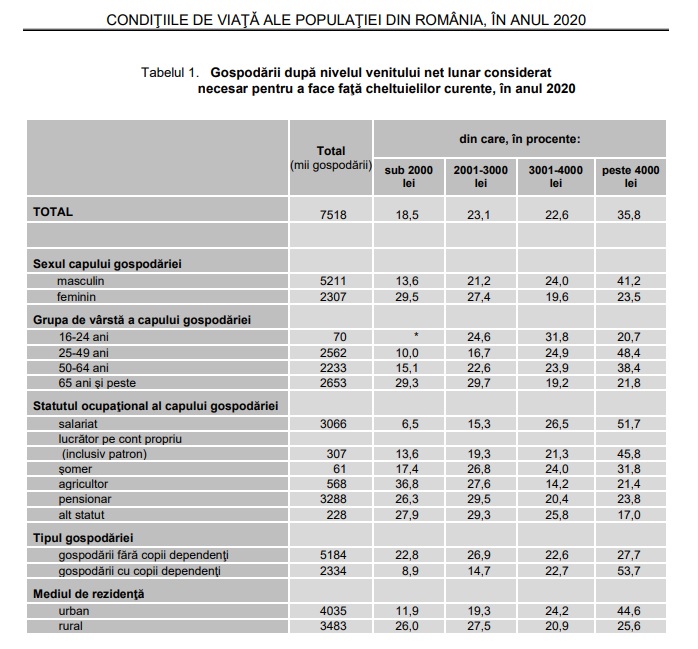 Astfel, aproape una din cinci gospodării consideră că pot efectua cheltuielile curente cu un venit bănesc net lunar minim cuprins sub 2000 lei, iar circa un sfert dintre gospodării au nevoie de un venit net lunar situat în intervalul 2001-3000 lei, respectiv în intervalul 3001-4000 lei pentru acoperirea cheltuielilor lunare. Mai mult de una din trei dintre gospodării consideră că venitul necesar acoperirii cheltuielilor curente ar trebui să fie chiar mai mare de 4000 lei lunar.
