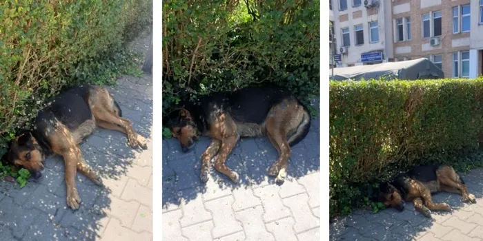 La prânz, cățelul se adăpostește de căldură în spațiul verde din proximitatea Unității de Primiri Urgențe.