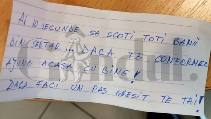 Potrivit surselor Gândul.ro, individul a scris pe bilet că angajata băncii are zece secunde să-i dea banii, în caz contrar, o taie!