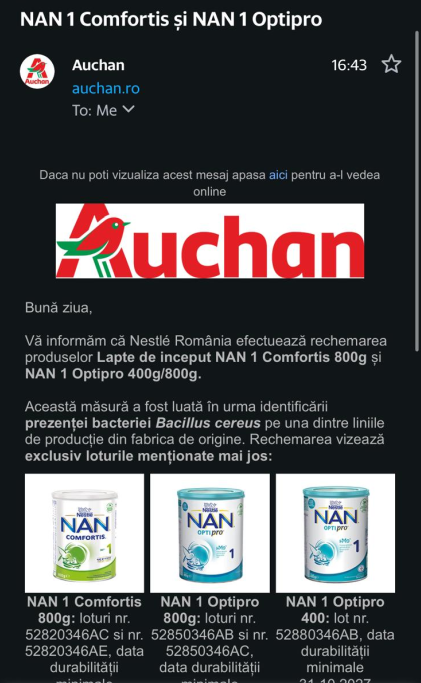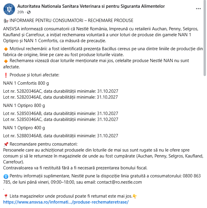 „Nestlé România iniţiază rechemarea voluntară pentru o cantitate limitată din produsele NAN 1 Optipro şi NAN 1 Comfortis, ca măsură de precauţie din cauza identificarii prezenţei Bacillus cereus pe una dintre liniile de producţie din fabrica de origine, linie pe care au fost produse loturile vizate. Siguranţa şi bunăstarea sugarilor este prioritatea noastră absolută. Menţionăm că nu au fost primite sesizari cu privire la efecte adverse asociate consumului produselor din loturile menţionate, rechemarea voluntară a acestora reprezentând o măsură de precauţie.”