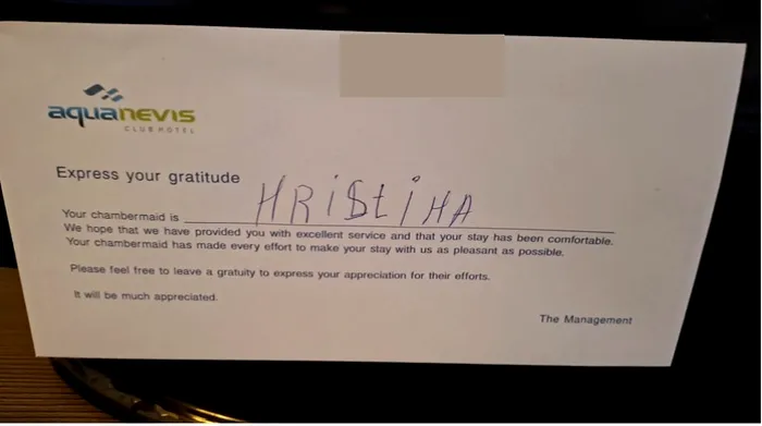 Ca să fie lucrurile clare, pe ușa camerei de hotel veți putea găsi, la întoarcerea în hotel, nota de plată a cameristei. E drept, nu și suma, așa că rămâne la latitudinea voastră să cuantificați prețul în funcție de calitatea serviciilor.