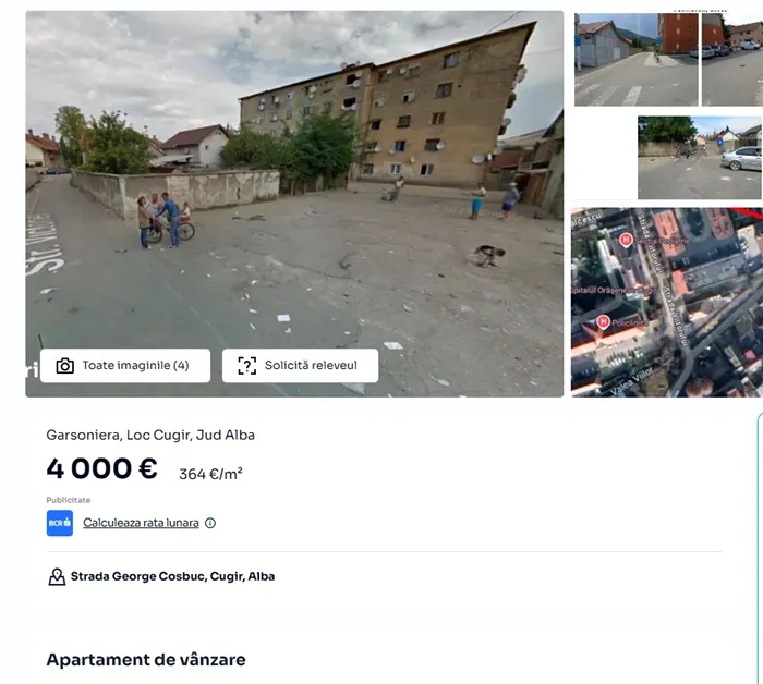 Potrivit unui anunț postat pe Storia, în localitatea Cugir, județul Alba, a fost scoasă la vânzare o garsonieră cu numai 4.000 de euro. În anunț se specifică faptul că este situată la parter, într-un bloc cu patru etaje, are o suprafață utilă de doar 11 metri pătrați și nu există fotografii cu interiorul ei.