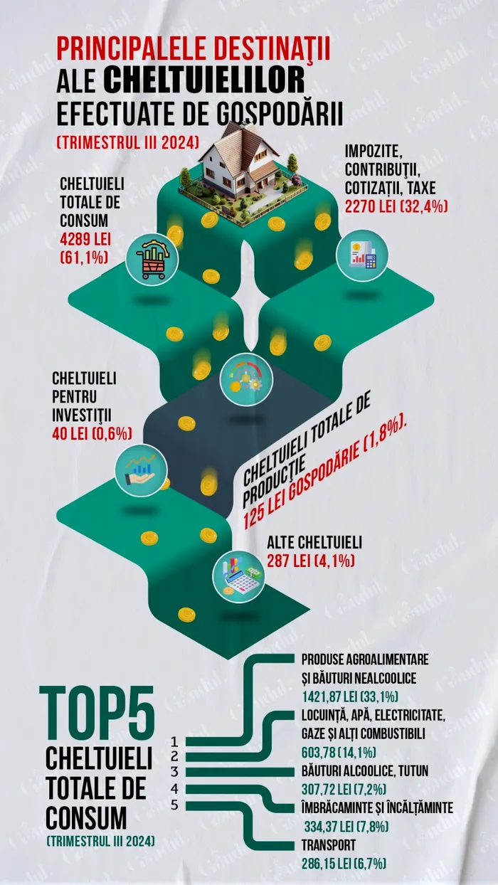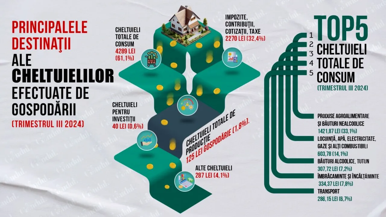 Cea mai mare parte din veniturile românilor, 85%, se duce în principal pe mâncare, taxe, impozite și utilități, conform Institutului Național de Statistică. Aceasta în condițiile în care veniturile au crescut cu 13,1%, iar cheltuielile cu doar 9%, comparativ cu aceeași perioadă a anului trecut.