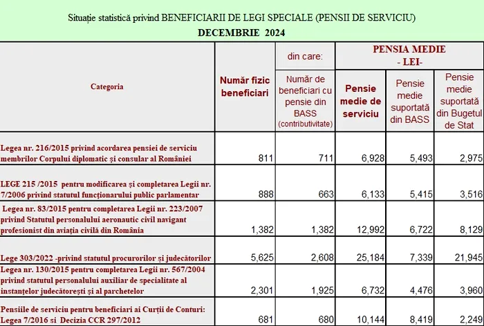 Cea mai mare indemnizație specială medie este mai mică decât cea mai mică pensie de serviciu medie. În total sunt 11.688 de persoane care sunt incluse în șase categorii de beneficiari de pensii de serviciu.