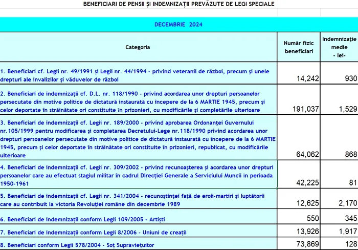 Categoria cu cele mai multe persoane, aproape jumătate din totalul de 412.536 de asigurați cu pensii și indemnizații speciale, este reprezentată de beneficiarii de indemnizaţii conform Decretului-Lege nr. 118/1990 privind acordarea unor drepturi persoanelor persecutate din motive politice de dictatură instaurată cu începere de la 6 MARTIE 1945, precum şi celor deportate în străinătate ori constituite în prizonieri, cu modificările şi completările ulterioare. Este vorba de 191.037 de beneficiari, care au o indemnizație medie de 1.529 lei, potrivit CNPP.