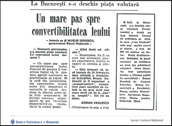 „La încheierea primei ședințe de licitație valutară interbancară, cursul de echilibru a fost stabilit, ăn funcție de cerere și ofertă, la nivelul de 200 lei pentru un dolar SUA”, scriau jurnaliștii acum 34 de ani.