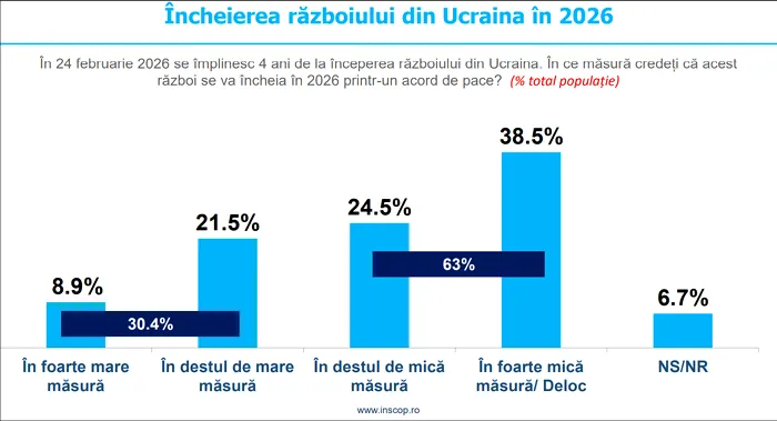 Conform sondajului condus de INSCOP  Research la solicitarea New Strategy Center, intitulat ”4 ani de război în Ucraina. Impactul profund asupra opiniei publice din România”,, doar 3 din 10 români cred că războiul din țara vecină se va încheia în 2026 printr-un acord de pace. De asemenea, aproape o treime dintre cei intervievați sunt de părere că în următorii 3 ani Rusia va declanșa un nou război în Europa”, notează G4Media. ro.