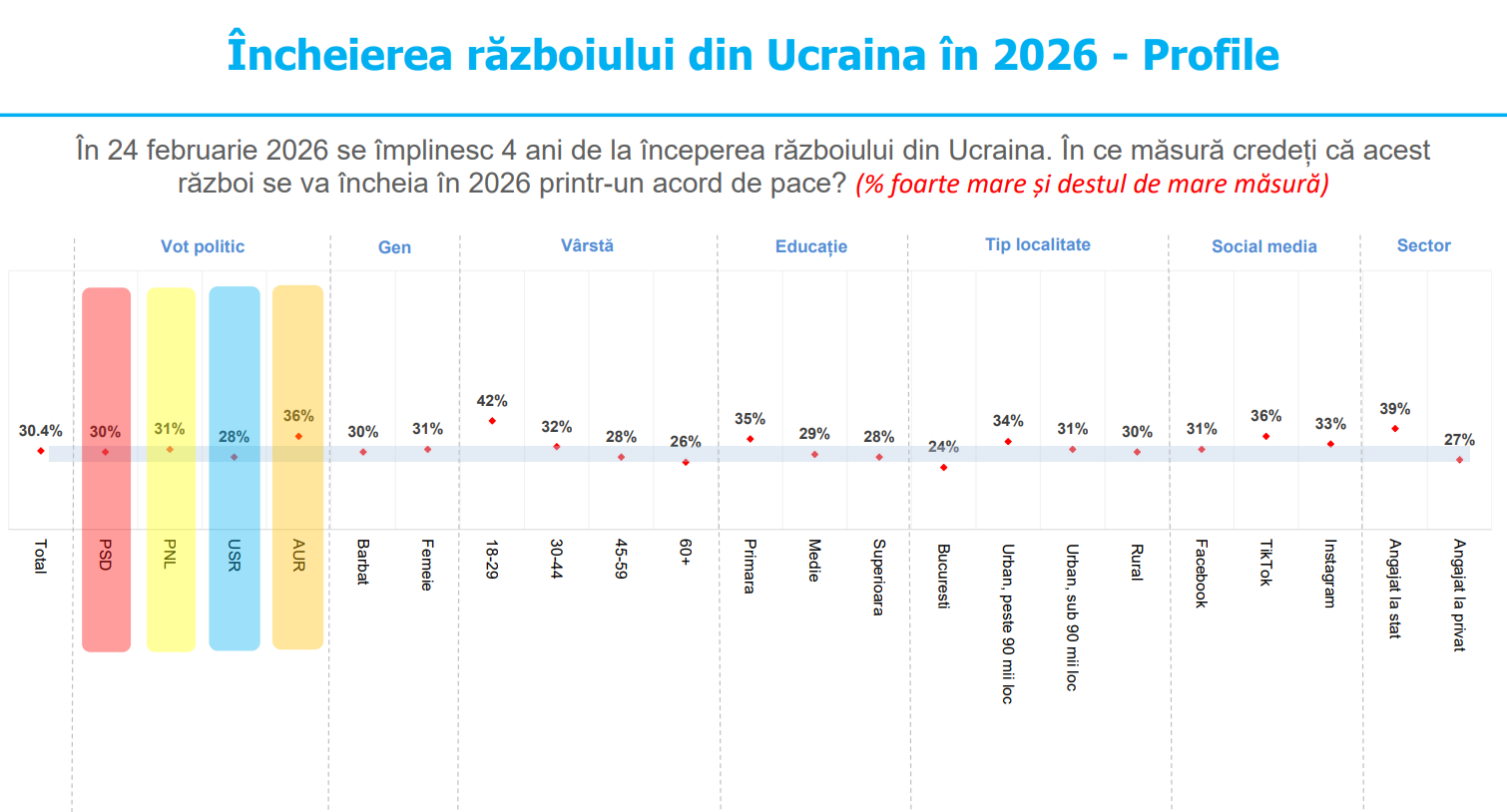 Respondenții care cred, într-o mai mare măsură decât media populației ,că războiul din Ucraina se va încheia în 2026, printr-un acord de pace, sunt: votanții AUR, tinerii sub 30 de ani, cei cu educație primară, locuitorii din urbanul mic, angajații din sectorul public.