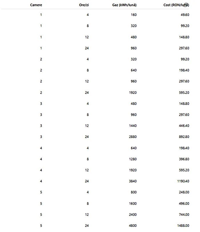 La un preț al gazului de 0.31 ron / kWh (TVA inclus), preț plafonat/de referință folosit de furnizori în 2025, cu o eficiență a centralei de 90%, mai exact pentru 1 1 kWh termic livrat, centrala consumă ≈1/0.9 = 1.11 kWh gaz ți cu o putere termică per cameră de 1.2 kW, au reieșit următoarele rezultate.