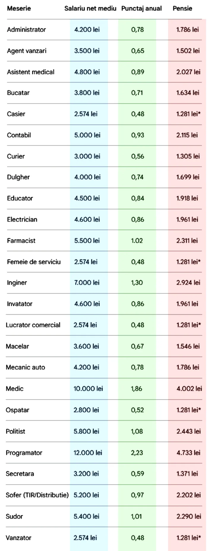 Meseriile cu cel mai mic punctaj sunt cele de: casier, femeie de serviciu, lucrător comercial și vânzător, acestea înregistrează pensii cu valoarea de 1.281 de lei.