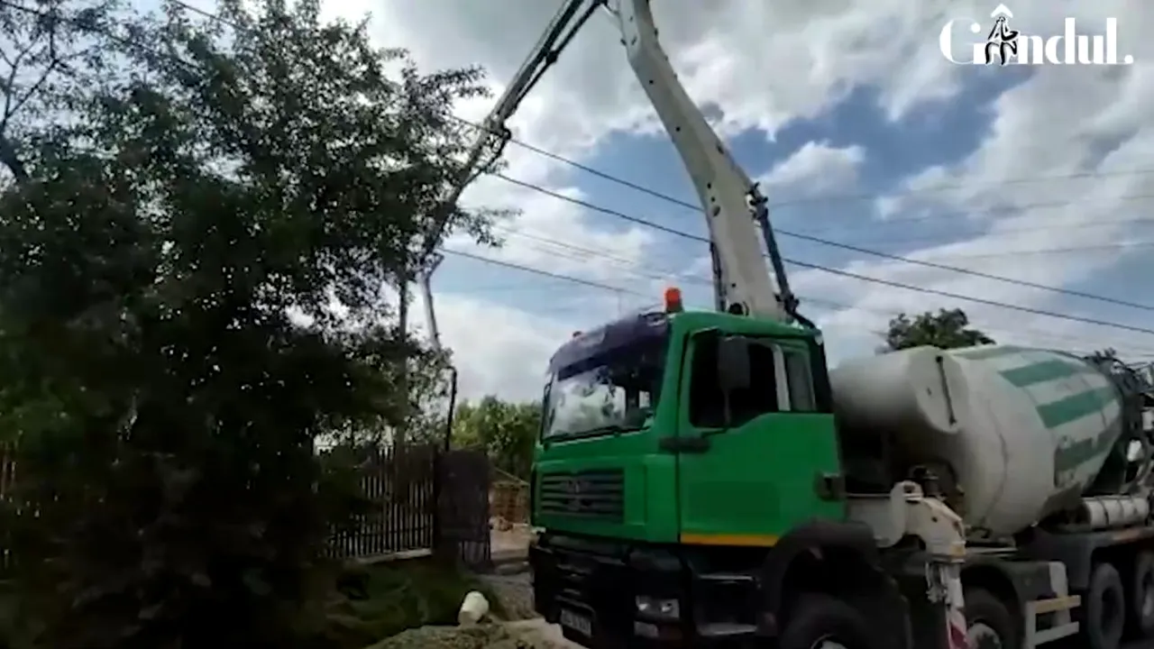 Mai exact, cel care conducea utilajul cu o telecomanda a atins cu brațul betonierei firele de înaltă tensiune.