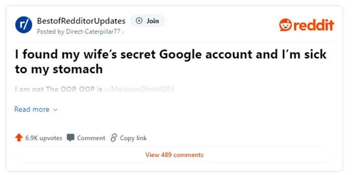 „Ea nu era acasă, eram doar eu și copilul, dar niciodată nu i-am cerut permisiunea de a folosi dispozitivele unuia celuilalt, am fost mereu deschiși în acest sens. Nu aveam nimic de ascuns. Așa credeam. Când am deschis tableta, am observat că avea deschisă fila „incognito. Niciodată nu mi-aș fi imaginat ce urma să descopăr. Soția mea avea un cont Google secret cu un album foto salvat numit „XX”. Așa că am dat click pe el”.