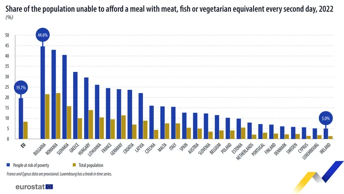 Aproximativ 8,3% din populaţia Uniunii Europene nu și-a permis, în anul 2022, o masă care să conţină carne, peşte sau echivalentul vegetal odată la două zile, cu un procent mai mult faţă de datele din anul anterior, după cum reiese din datele publicate luni de Oficiul European de Statistică. În plus, este în creștere și ponderea la nivelul Uniunii Europene a persoanelor aflate în risc de sărăcie, de la 17,5% în 2021, la 19,7 în 2022.