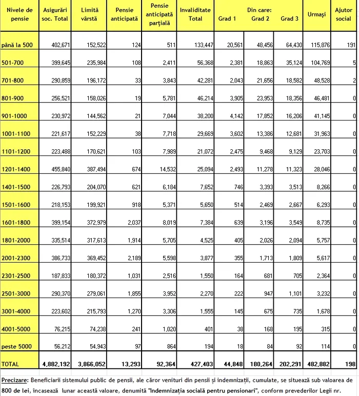 Conform datelor CNPP, în iunie 2021, peste 402.600 de pensionari din totalul sistemului asigurărilor sociale aveau o pensie conform deciziei de de până la 500 de lei, aproape 400.000, cuprinsă între 501 și 700 de lei, și aproximativ 290, între 701 și 800 de lei. La polul opus, aproximativ 56.200 de pensionari au primit o pensie de peste 5.000 de lei.