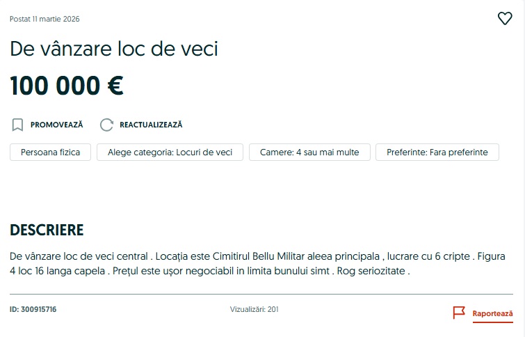 „De vânzare loc de veci central. Locația este Cimitirul Bellu Militar aleea principala, lucrare cu 6 cripte. Figura 4 loc 16 langa capelă. Prețul este ușor negociabil in limita bunului simt. Rog seriozitate”, scrie în anunț.
