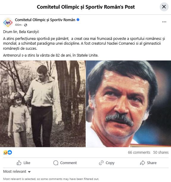 „Drum lin, Bela Karolyi! A atins perfecțiunea sportivă pe pământ, a creat cea mai frumoasă poveste a sportului românesc și mondial, a schimbat paradigma unei discipline. A fost creatorul Nadiei Comăneci și al gimnasticii românești de succes. Antrenorul s-a stins la vârsta de 82 de ani, în Statele Unite”, se arată în postarea Comitetului Olimpic și Sportiv Român.