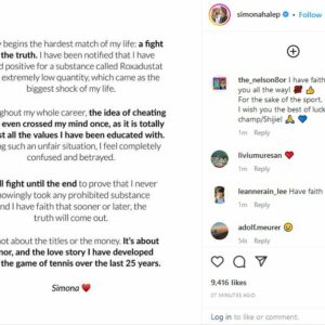 Simona Halep a fost prinsă dopată la un test anti-doping efectuat la US Open, în 2022. Agenția Internațională de Integritate a Tenisului a suspendat-o pe româncă din circuitul WTA, decizia fiind provizorie până la finalizarea anchetei.