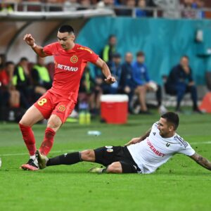 Adrian Gheorghe Sut si Ovidiu Alexandru Bic in meciul de fotbal dintre FCSB si Universitatea Cluj, din cadrul Superligii Superbet, desfasurat pe Arena Nationala din Bucuresti, luni 2 octombrie 2023. © FOTO:Razvan Pasarica/SPORT PICTURES
