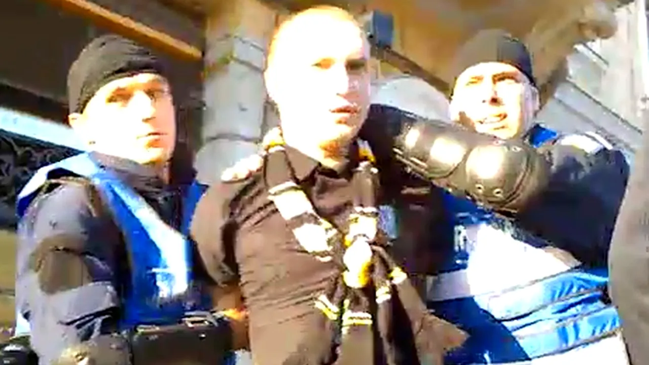 În imaginile filmate de gândul, se observă cum un suporter este imobilizat și reținut de jandarmi, în Piața Unirii din Cluj.
