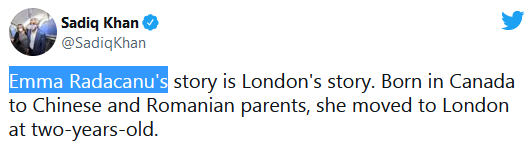 Primarul Londrei, Sadiq Khan, i-a transmis – pe Twitter – un mesaj de felicitare Emmei Răducanu, după ce a câștigat finala US Open 2021. Chiar dacă i-a greșit numele de familie, scriind „Radacanu”, în loc de „Raducanu”, emoționant a fost gestul său de a pune steagurile celor patru state care au legătură cu viața sportivei cu rădăcini românești (mama ei este de origine chineză, iar tatăl său este român). Ulterior, mai mulți useri i-au atras atenția asupra numelui scris greșit.