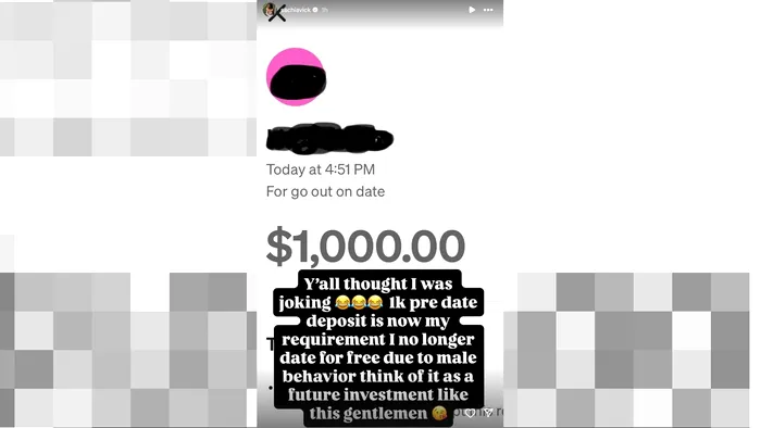 „Ies cu bărbații la întâlniri doar dacă îmi dau 1.000 de dolari înainte!Nu mai am întâlniri gratuite din cauza comportamentului bărbaților. Acum am un depozit pentru care percep bani înainte de întâlnire. Trimiteți-mi 1.000 de dolari și putem rezolva problema”, a scris Vickery.